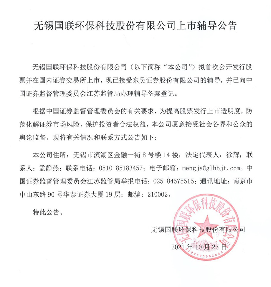 無錫國聯環??萍脊煞萦邢薰旧鲜休o導公告